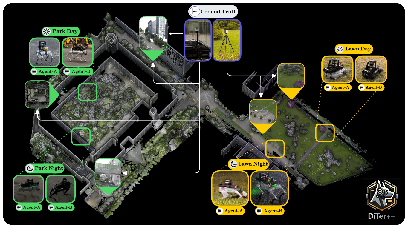 We encounter large-scale environments where both structured and unstructured spaces coexist, such as on campuses. In this environment, lighting conditions and dynamic objects change constantly. To tackle the challenges of large-scale mapping under such conditions, we introduce DiTer++, a diverse terrain and multi-modal dataset designed for multi-robot SLAM in multi-session environments. According to our datasets' scenarios, Agent-A and Agent-B scan the area designated for efficient large-scale mapping day and night, respectively. Also, we utilize legged robots for terrain-agnostic traversing. To generate the ground-truth of each robot, we first build the survey-grade prior map. Then, we remove the dynamic objects and outliers from the prior map and extract the trajectory through scan-to-map matching.